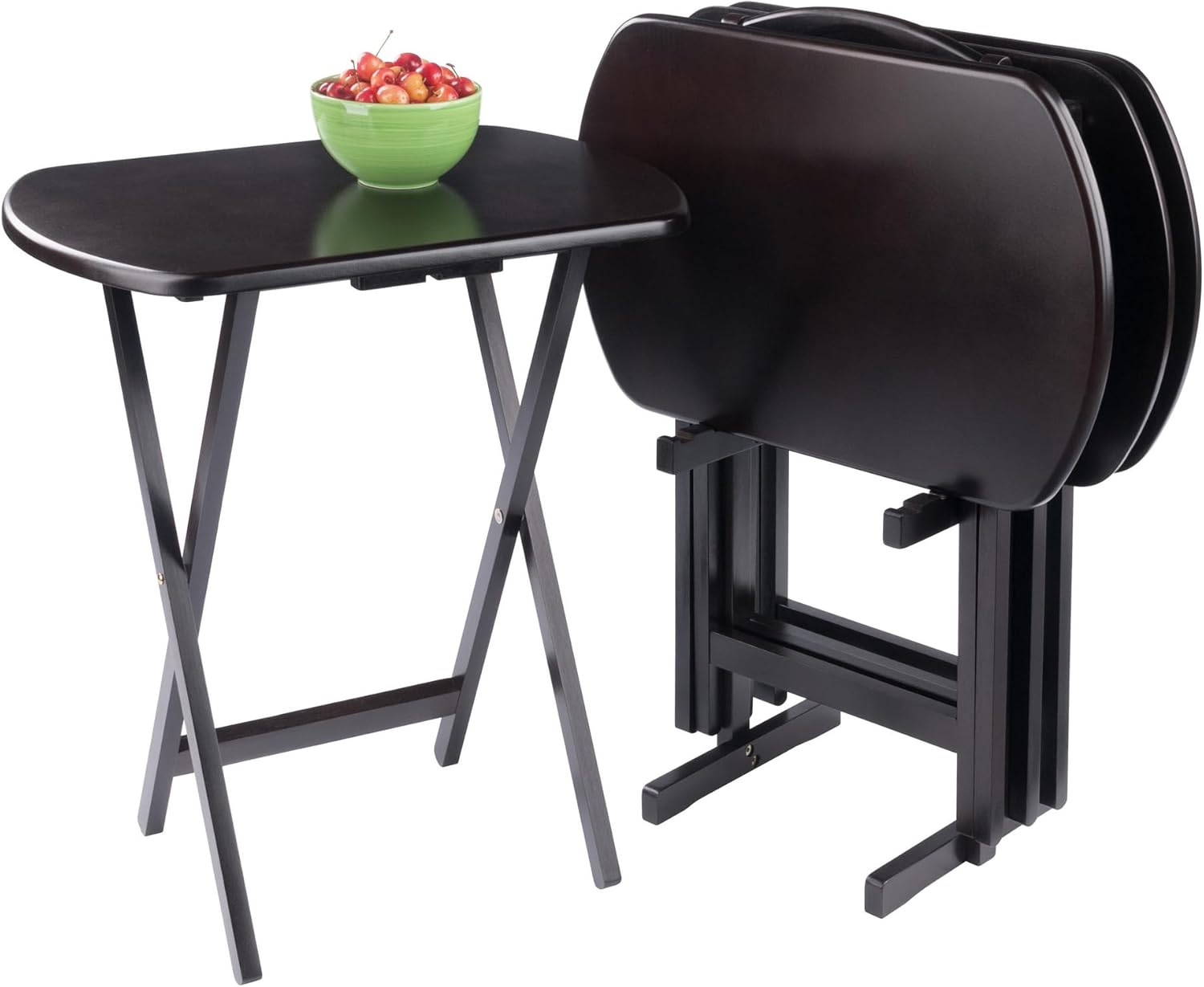 Great for keeping in dining room, kitchen or game room, the Corbett 5 Piece Oversize Oblong TV Table Set is great to have for work and play time. With "Oblong" tops, these wood TV Tables can easily hold a large meal with style. An upright stand stores them when not in use. Crafted from durable materials using expert furniture construction techniques for long-lasting use, these folding tables have a sleek, timeless color finish lets them work with any home decor. They are ideal for smaller homes, dorms, and apartments, taking up minimal storage space while providing essential functionality and design. With clear instructions and a simple, hassle-free setup, these tables let you enjoy your new piece right away.