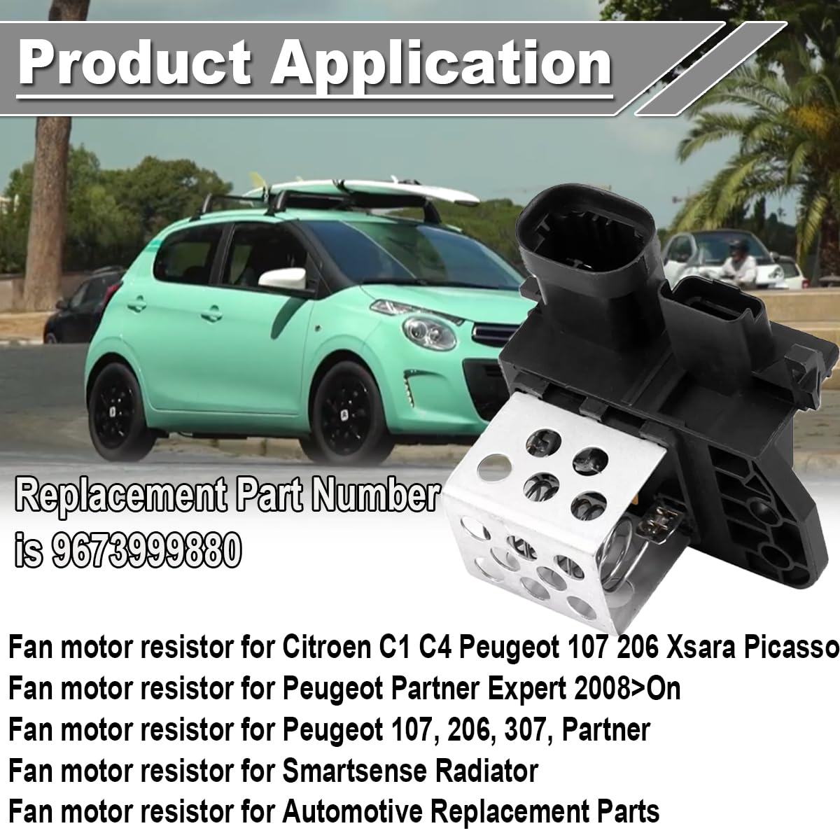 Reference OE/OEM Number 9673999880 Scope of Application: Fits for Citroen Berlingo 2008- Fits for Citroen C1 2014- Fits for Citroen C4 2004-2010 Fits for Citroen C4 Picasso 2006- Fits for Citroen C4 Spacetourer 2013- Fits for Citroen C4 2010- Fits for Citroen C-Elysee 2012- Fits for Citroen DS4 2011- Fits for Citroen Jumpy 2006-16 Fits for DS4 2011- Fits for DS5 2011- Fits for Peugeot 108 2014- Fits for Peugeot 3008 2008-2014 Fits for Peugeot 301 2012- Fits for Peugeot 307 2001-2008 Fits for Peugeot 308 2007- Fits for Peugeot 5008 2009-2016 Fits for Peugeot Expert 2006- Fits for Peugeot Partner 2008- Fits for Peugeot RCZ 2010- Fits for Peugeot Traveller 2016- Fits for Automotive Replacement Parts Features: Made of high quality aluminum and ABS for maximum durability. Stable characteristics, high reliability, resolves over heating issues. Effective and precise control of blower speed. direct replacement for the old or broken one. Specification: Material: Aluminum + ABS Product Includes: 1 x 9673999880 fan motor resistor 1 x insulating tape