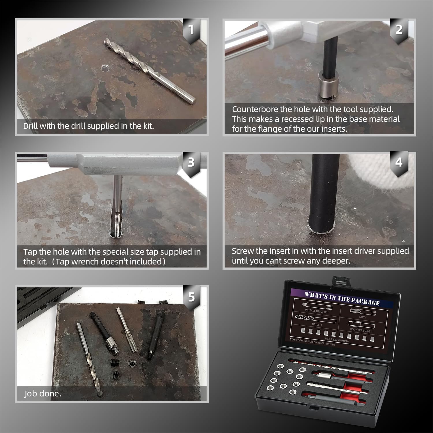 | Included Components | Drill, Counterbore, Tap, Install Driver, M8x1.25x11.7mm Inserts |