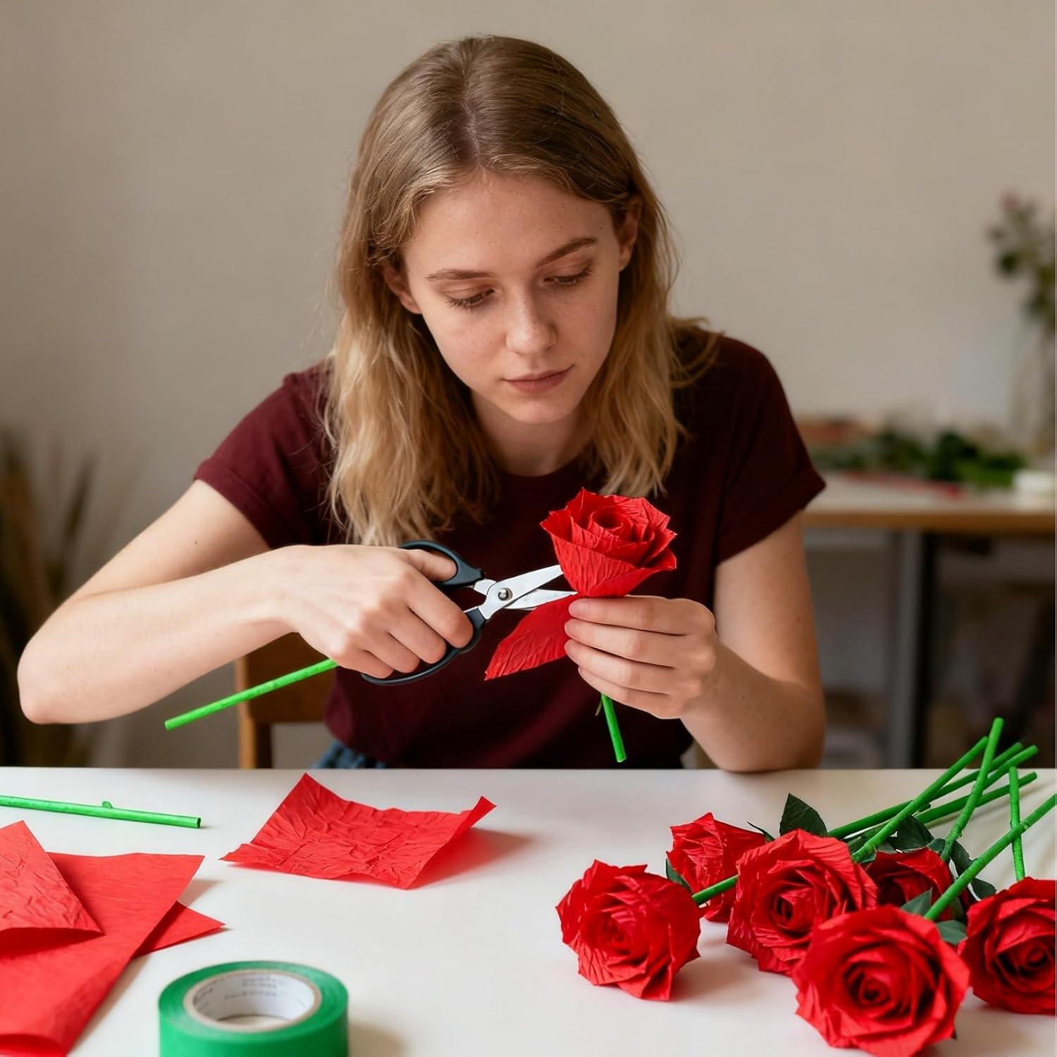 Crepe Paper Set of 6 Colourful, 6 Rolls 25 x 200 cm Crepe Paper Pink Tones with 15 Flower Wire Green, 2 Hot Glue Stickers, Florist Tape, Double-Sided Tape, Ruler, Sewing Thread, Crepe Paper Flowers Crafts (Rose Series)