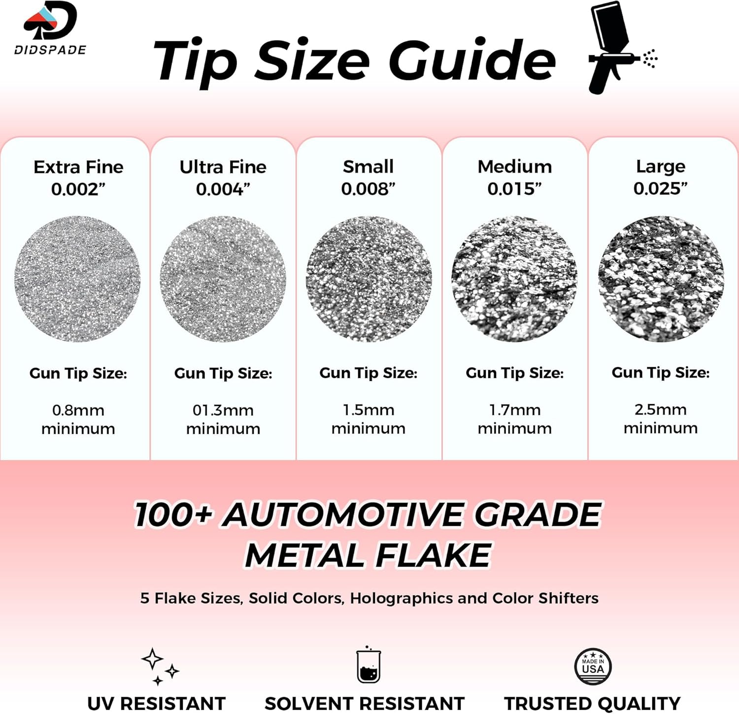 Elevate your automotive paint projects with our Premium Automotive Grade Metal Flake. This specially crafted solvent resistant glitter is designed to add a touch of glamour and dimension to your vehicle's paint job. The Metal Flake finish creates a stunning effect that catches the light and gives your car a unique and eye-catching appearance. Whether you're working on custom car designs, motorcycle detailing, or any other automotive paint project, Didspade's Metal Flake will help you achieve a professional and show-stopping finish. Available in five sizes - Extra Fine 0.002", Ultra Fine 0.004", Small 0.008", Medium 0.015", and Large 0.025" - you can choose the perfect size to achieve the desired effect. With over 35 vibrant flake colors to choose from, you can customize your automotive paint job to suit your style and preferences. Our flake is available in 2oz jars, as well as 4oz or 6oz jars (depending on the glitter size), making it convenient to use for projects of any scale. Didspade is a trusted brand in the industry, we supply the highest quality flake available, ensuring that your projects shine with excellence. Our premium flake is proudly made in the USA, guaranteeing superior quality and performance for your automotive paint projects.