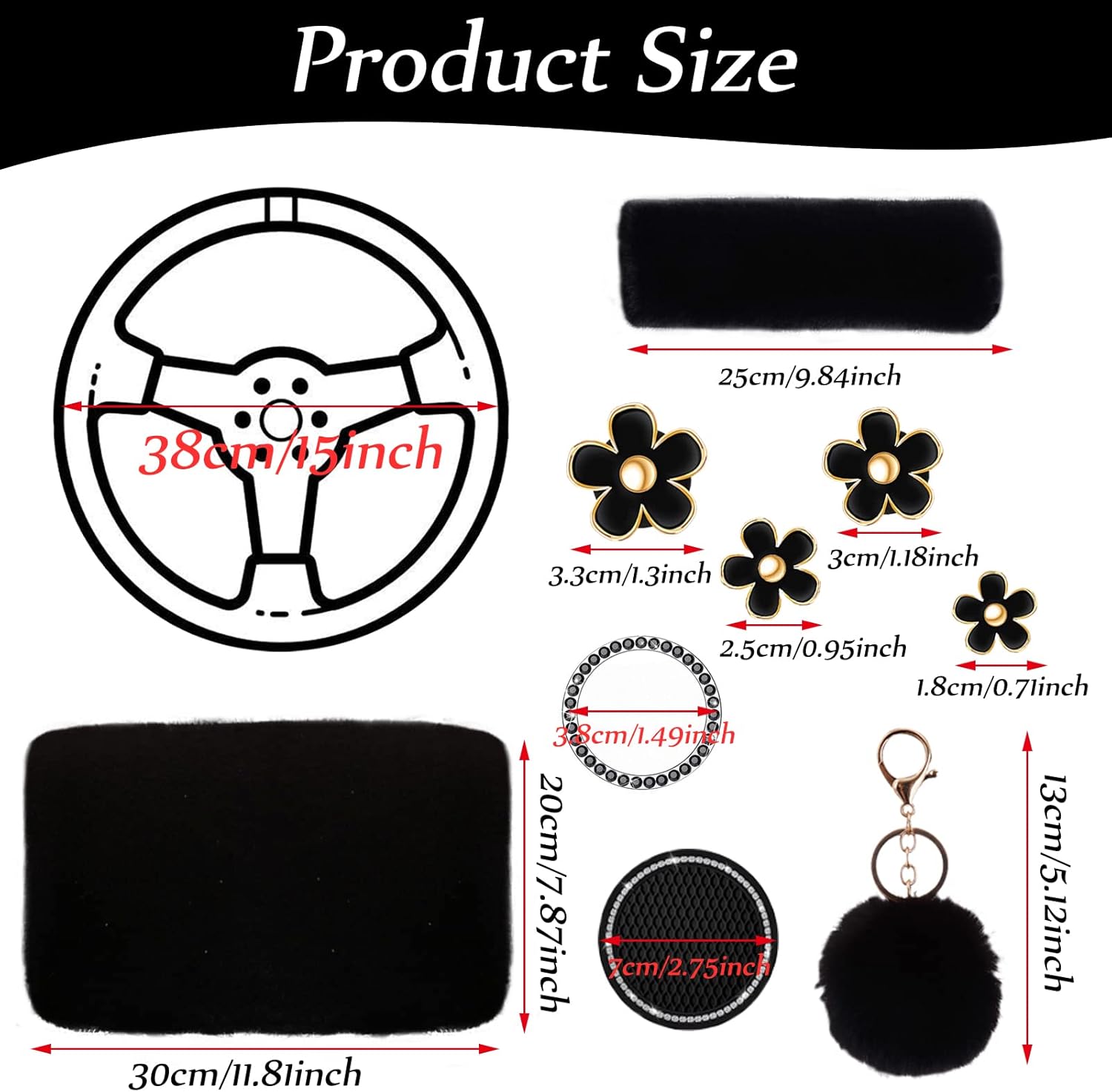 | Included Components | Package: 1 * fluffy steering wheel cover 1 * fluffy gear shift cover 1 * fluffy handbrake cover 2 * fluffy seat belt covers 1 * fluffy armrest cover 2 * bling car coasters 1 * bling emblem sticker 1 * fluffy keychain 4 * flower car air vent clips |