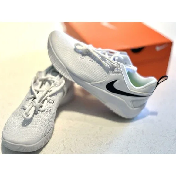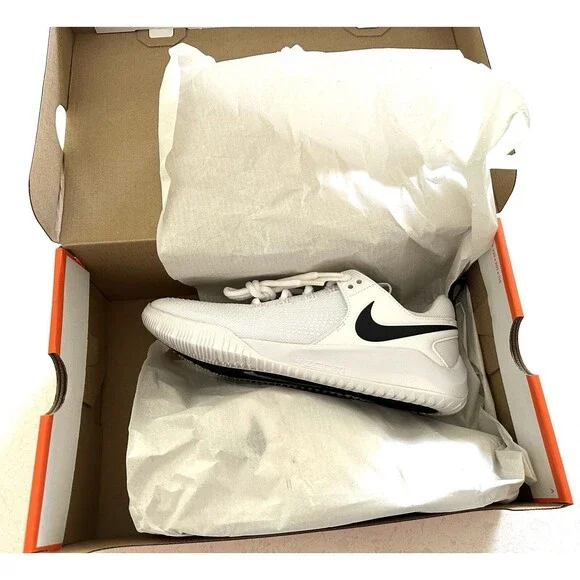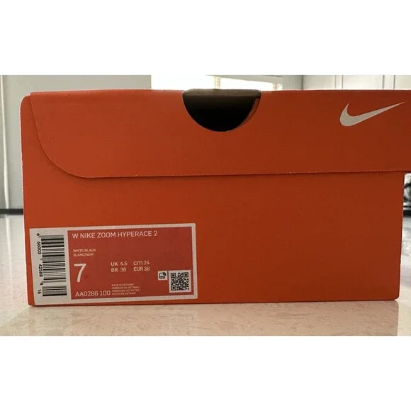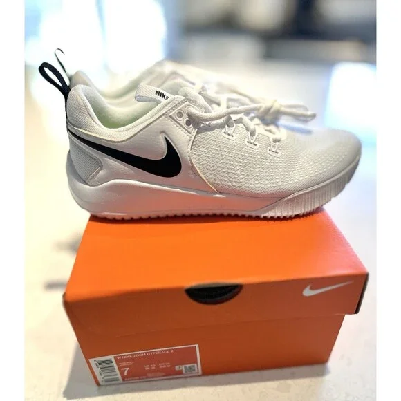 Bought for my daughter but she needed a diff kind for her club team. Women's Nike Zoom Hyperace 2, all white with black swoosh, brand new in box, unworn athletic sneaker designed for volleyball. Standard shoe width and a UK shoe size of 4.5, US shoe size 7, and EU shoe size 38 Comfortable fit for women looking to enhance athletic activities. Made by Nike in Vietnam, this 2021 release is part of the Nike Zoom product line.