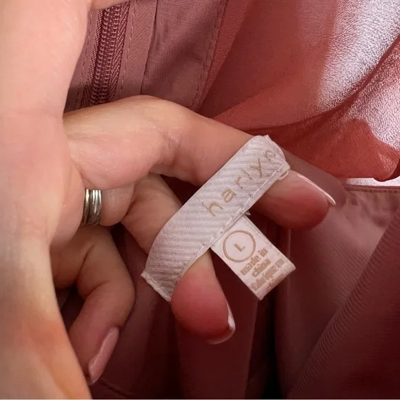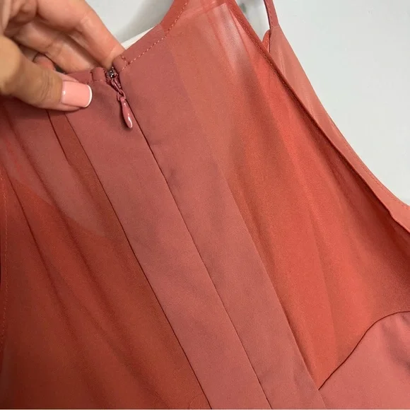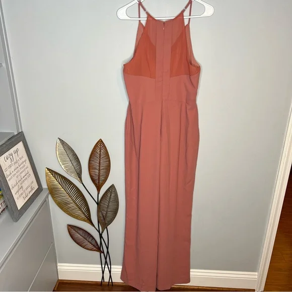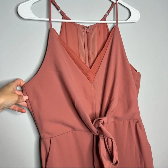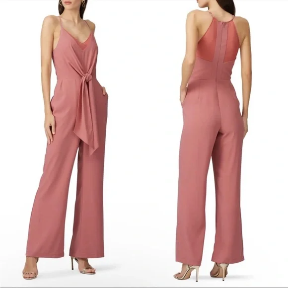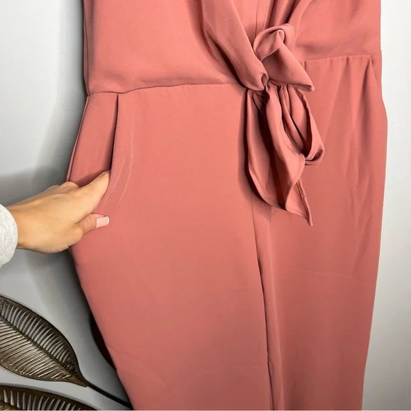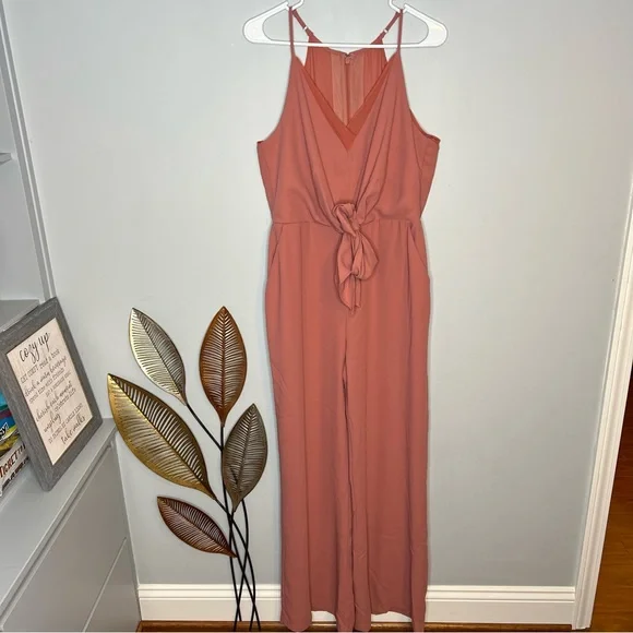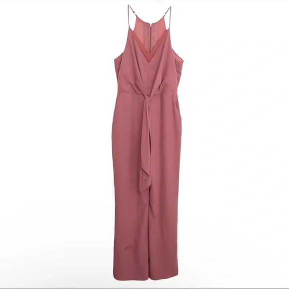 Harlyn Terracotta Sleeveless V-Neck TieWaist JumpsuitWomen's Size LargeRose pink color, like a darker blushApproximate Measurements:Top of shoulder to bottom hem: 61" w adjustable strapsThis Harlyn jumpsuit features:Rose pink solid colorV-neckSheer fabric with inside liningLong legTie waistStraps adjustable Sleeveless armsM23⭐️