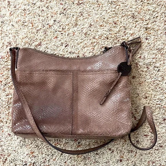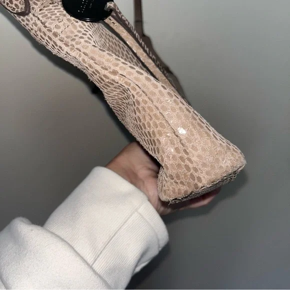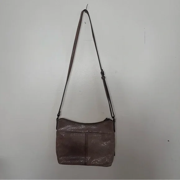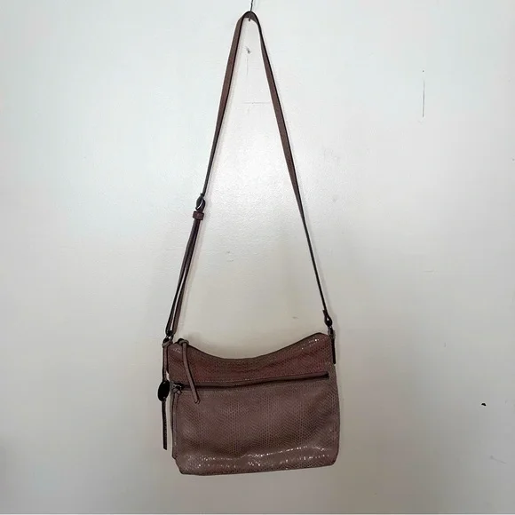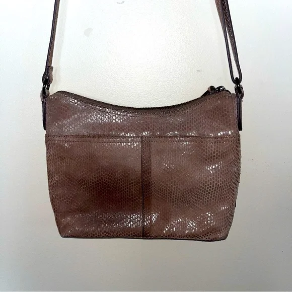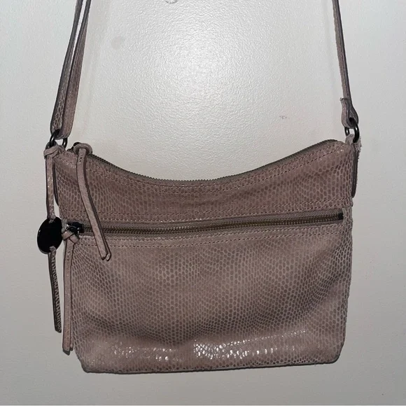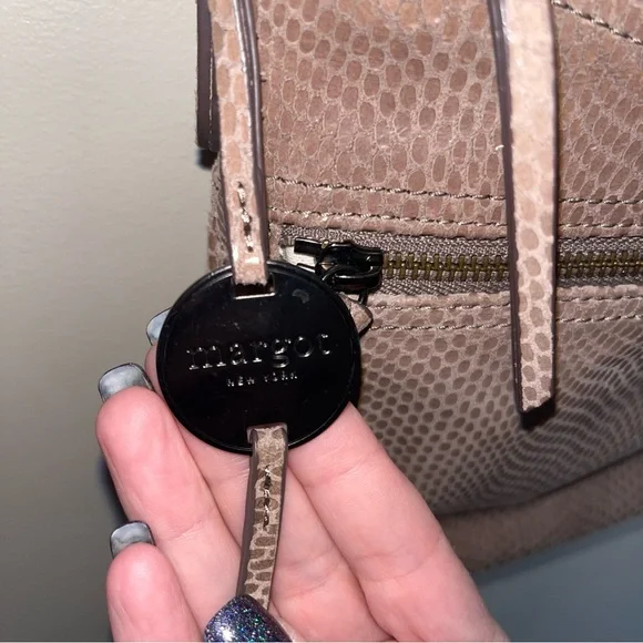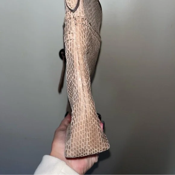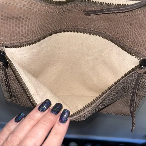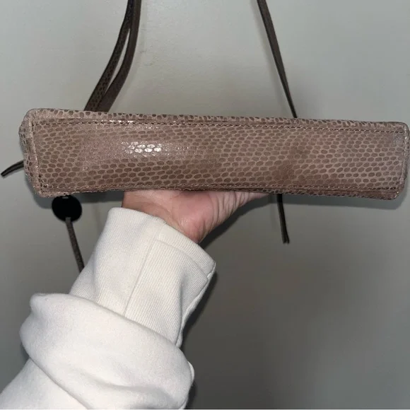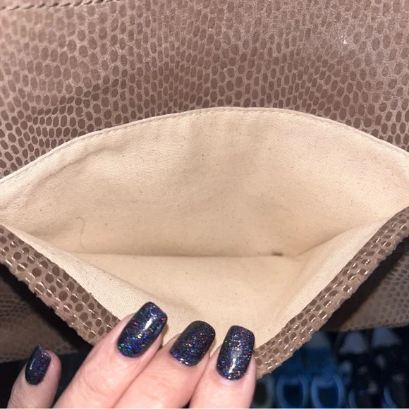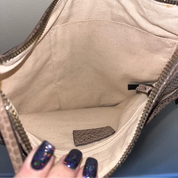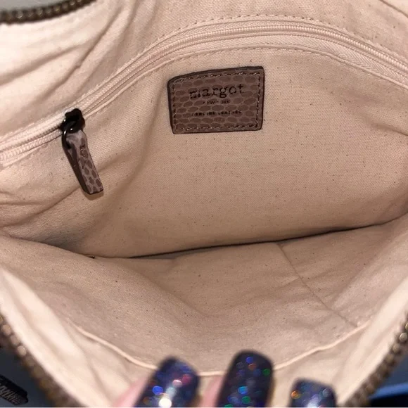 Margot Mary Scoop Tan Snakeskin Crossbody bag. Margot Mary Scoop beige taupe python print cross body shoulder bag. This cute designer purse has snakeskin print with a metallic sheen, gold hardware, a zip top, front zip pocket, back open pocket. Cream fabric lining, with three interior pockets. Dimensions: 10.5" W x 8.5" H x 2" D. Strap drop: 23"