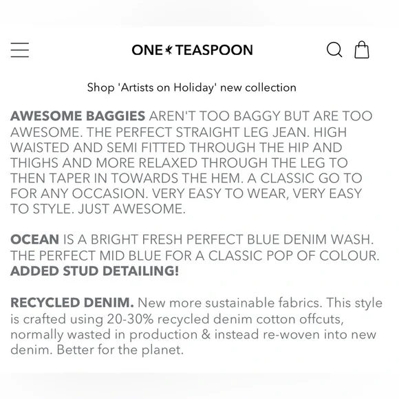 No flaws100% cotton/recycled cottonMeasurements and details in photos AWESOME BAGGIES AREN'T TOO BAGGY BUT ARE TOO AWESOME. THE PERFECT STRAIGHT LEG JEAN. HIGH WAISTED AND SEMI FITTED THROUGH THE HIP AND THIGHS AND MORE RELAXED THROUGH THE LEG TO THEN TAPER IN TOWARDS THE HEM. A CLASSIC GO TO FOR ANY OCCASION. VERY EASY TO WEAR, VERY EASY TO STYLE. JUST AWESOME.