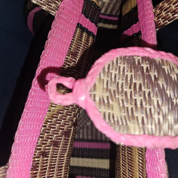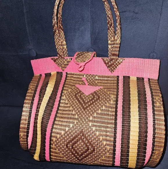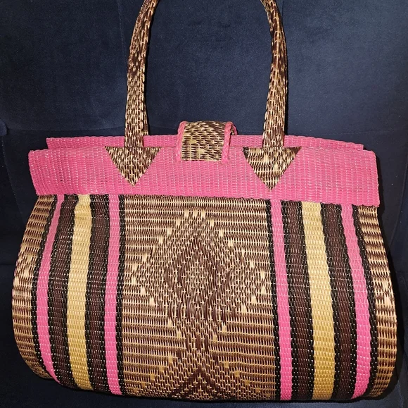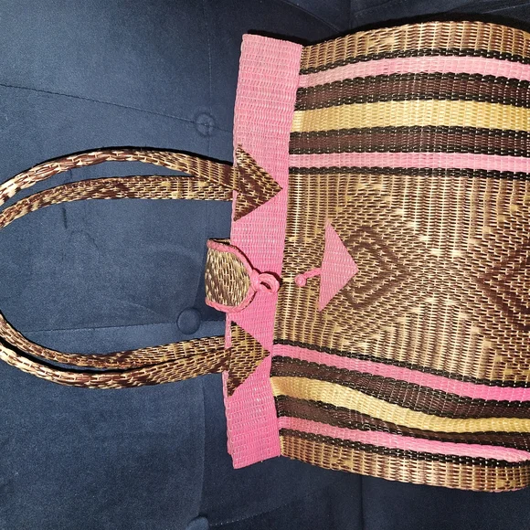 Brand new and ready to find a new home.Handmade Wedt African pink, creme, and brown woven barrel bag fit for any glamor girl!Elevate your style with this chic woven tote bag. Featuring a beautiful blend of pink and brown, this bag is perfect for any occasion. Its spacious design makes it ideal for everyday use.