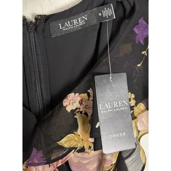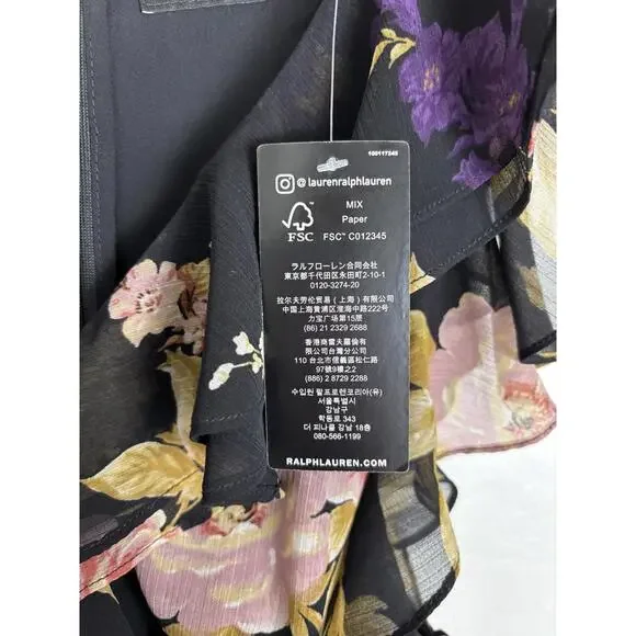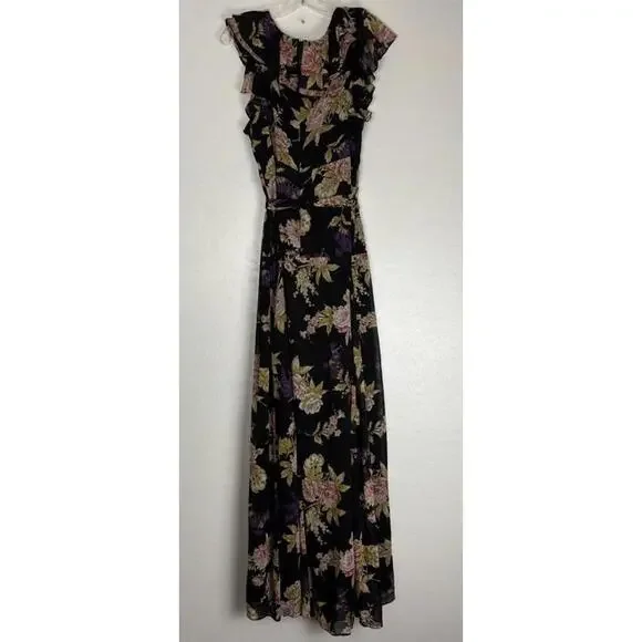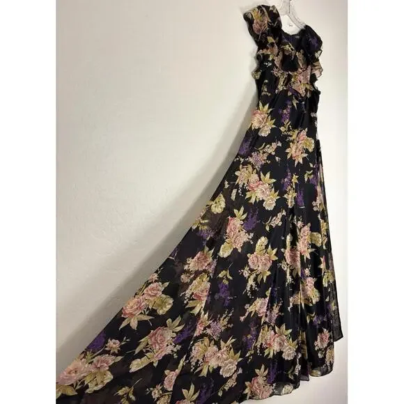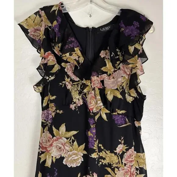 The Ralph Lauren Maxi Long Dress is a stunning piece perfect for various occasions including travel, weddings, parties, casual outings, and more. This black dress features a floral pattern, ruffled accents, and a belted waist for added elegance. Made from polyester chiffon fabric, this dress has a sleeveless design, V-neckline, and a zip closure. The fit and flare style, along with the maxi length, create a flattering silhouette, making it a versatile and stylish addition to your wardrobe.Pit to pit 18”Waist 15”Length 63”