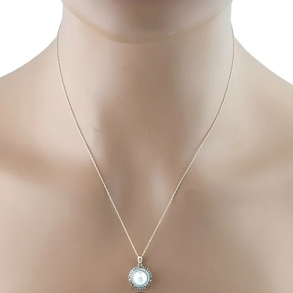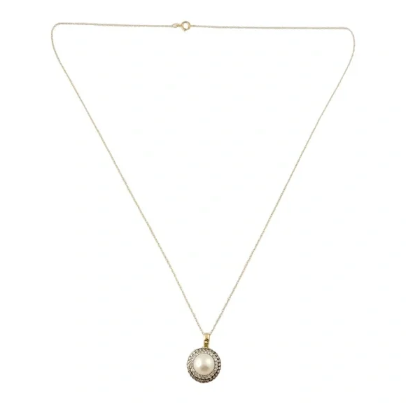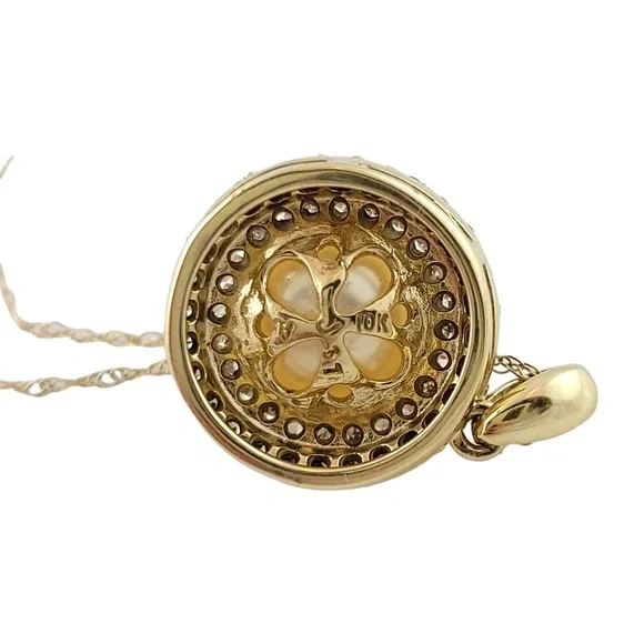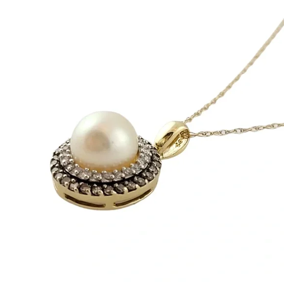 Vintage 10K Yellow Gold Pearl Diamond Pendant With ChainThis gorgeous 10k chain is paired with a gorgeous pearl pendant surrounded by 50 single cut diamond!(1 pearl; 7.5mm) (28 champagne diamonds)(22 white diamonds)Approximate total diamond weight: 0.25 ctsDiamond clarity: SI1, I1Diamond color: I (white)Chain length: 18"Size: 12.5mm X 12.5mm X 8.5mmLength w/ bail: 18mmWeight: 2.5 g/ 1.6 dwtHallmark: JA 37 10KVery good condition, professionally polished.Will come packaged in a gift box or pouch (when possible) and will be shipped U.S. Priority Mail Insured.MM01032023/17KCS