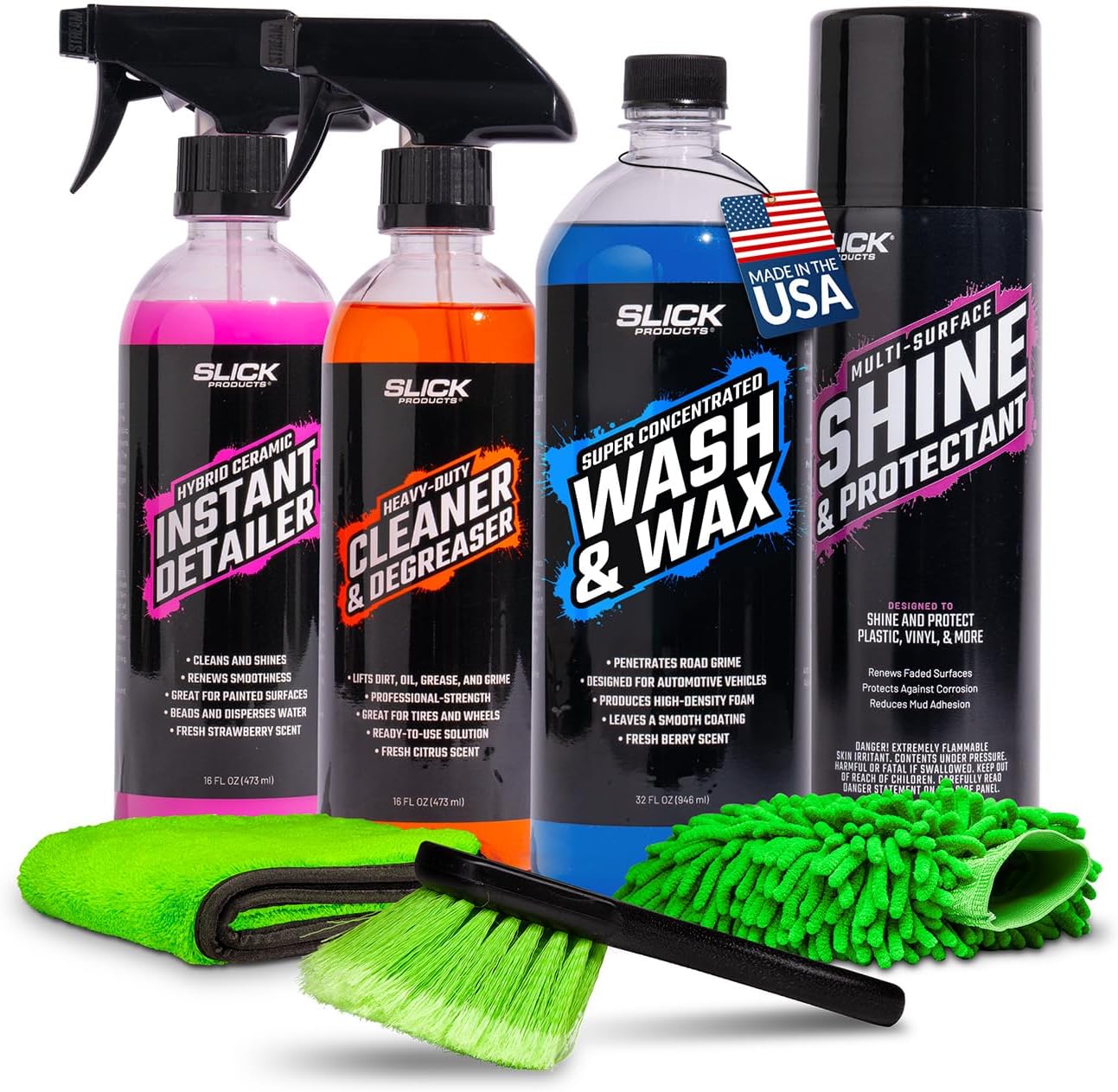 Slick Products USA has been manufacturing the highest quality, professional grade car wash soaps, waxes, polishes, compounds, and detailing accessories in the USA for over 30 years. Our mission is to provide car care enthusiasts with the best products and knowledge to safely clean and detail their vehicles and achieve professional results. Our detailer's choice bundle includes our best-selling products to get you started with your auto detailing business or to replace products that you have run out of. The Off-Road Starter Bundle Includes: (1) Off-Road Wash Concentrate 32oz. (1) Cleaner & Degreaser 16oz. (1) Shine & Protectant 13oz. (1) Scrub Brush (1) Wash Mitt (1) Microfiber Towel